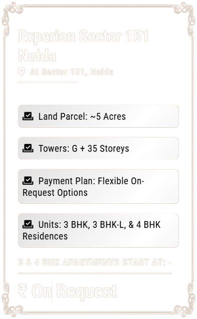 Experion Sector 151 Noida is a premium residential development by Experion Developers, crafted to deliver a luxurious and contemporary lifestyle. Spanning 5 acres, the project offers spacious 3 and 4 BHK apartments with elegant architecture and top-tier amenities. With a planned investment of ₹1,000 crore, this upcoming venture is set to redefine urban living with state-of-the-art facilities and exceptional connectivity.
